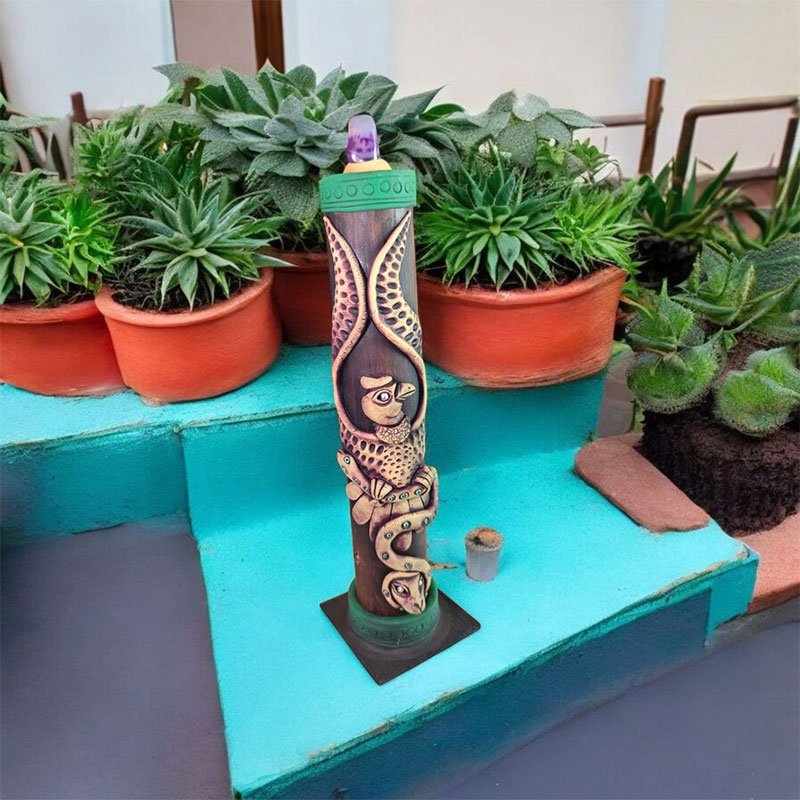 Fabricado artesanalmente en bambú sostenible, su estructura es ligera, resistente y totalmente eco-friendly, perfecta para transportar, usar a diario y decorar con propósito. Sus grabados inspirados en símbolos de poder de la Amazonía lo convierten en una pieza que decora, atrae miradas y potencia la intención del espacio.