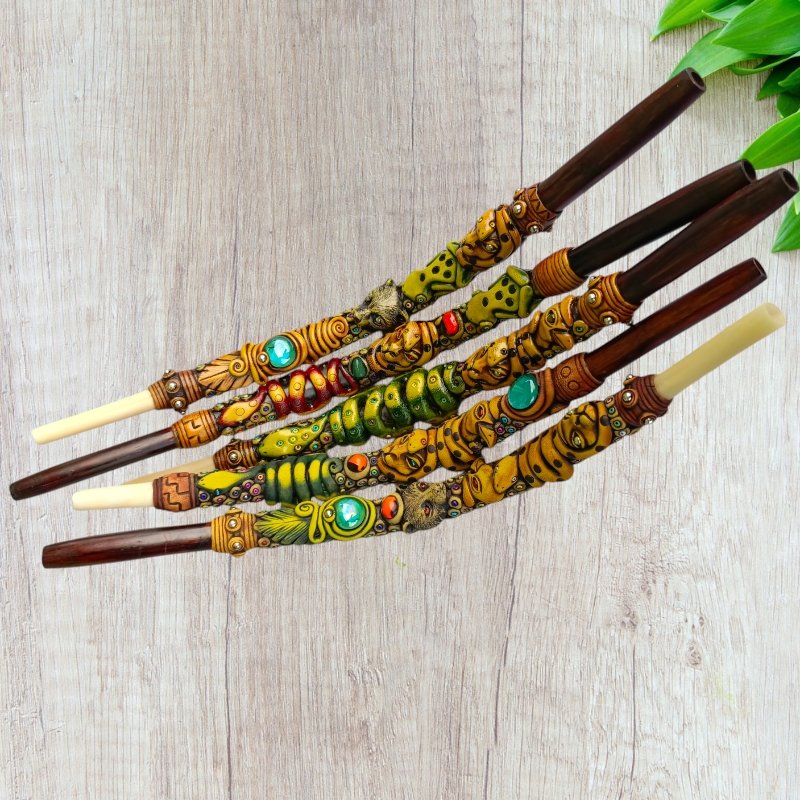 Artículos ceremoniales, donde la magia del Palo Santo se une con la artesanía y la espiritualidad para ofrecerte un Tepy verdaderamente excepcional para tus ceremonias chamánicas! Sumérgete en la profundidad de la conexión con el mundo espiritual a través de nuestro Tepy elaborado en Palo Santo, adornado con hermosos diseños y mostacillas que representan a la rana, la serpiente y el águila, símbolos sagrados que evocan la sabiduría ancestral y el poder de la naturaleza.